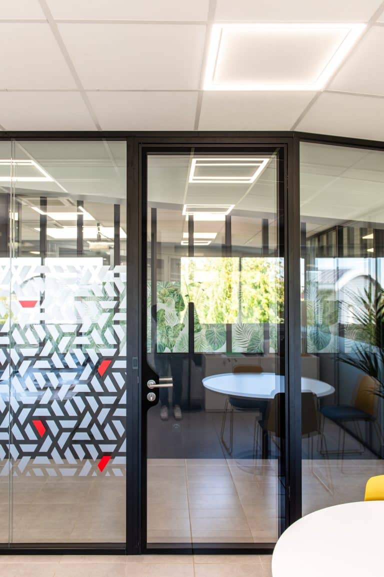 En double vitrage, C+ FIFTY cloison modulaire Clips®, peut accueillir une liaison décorative découpée au jet d’eau ou au laser pour intégrer une signalétique design directement à la cloison amovible. Motifs et / ou textes viennent ainsi habiller la cloison.